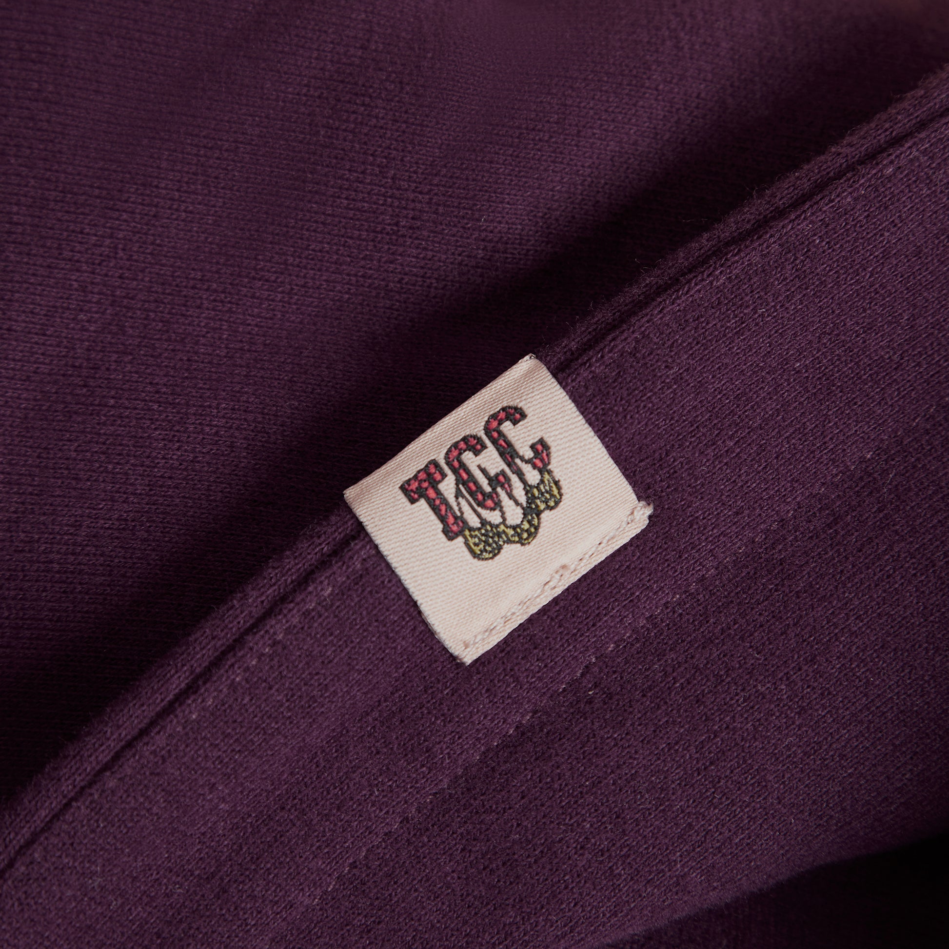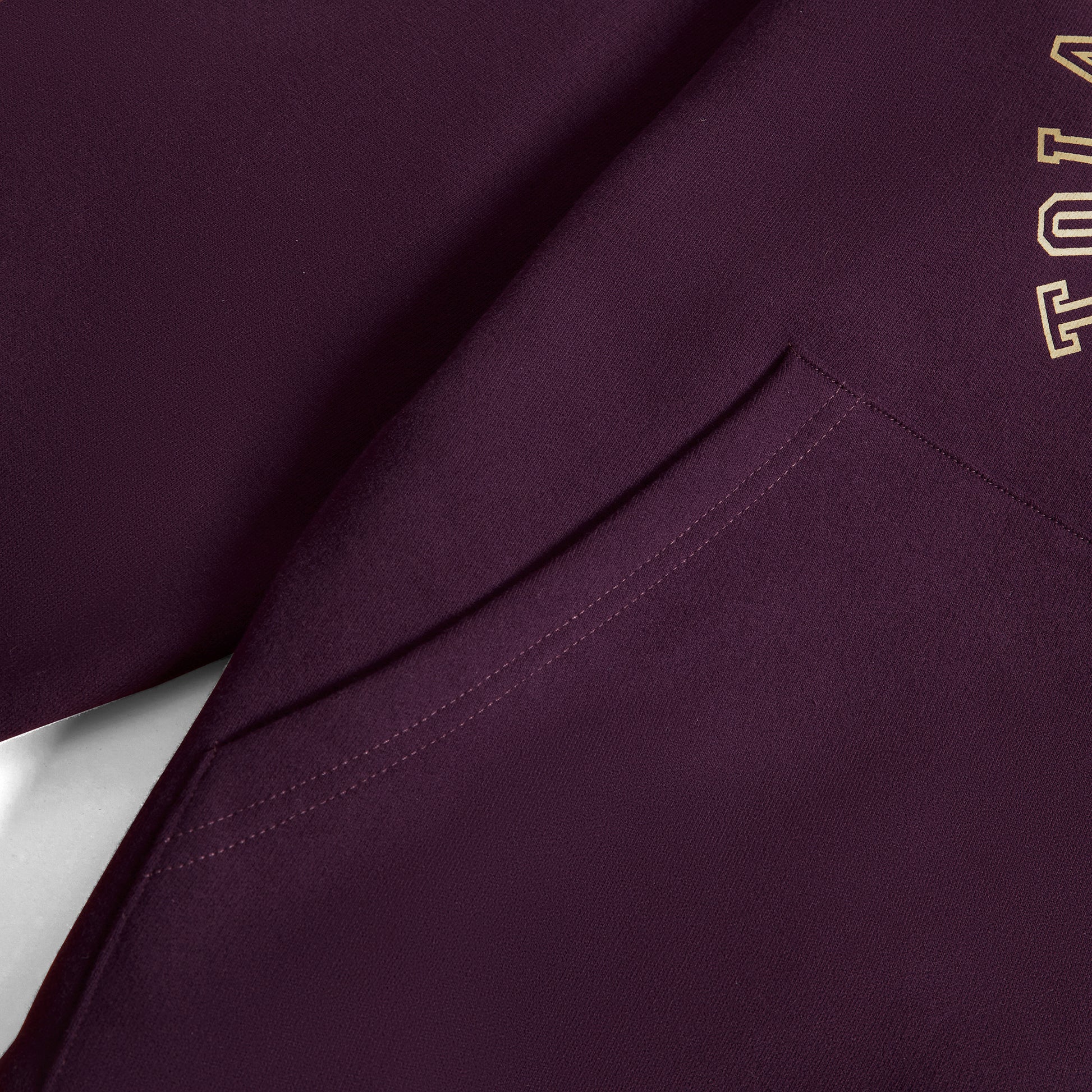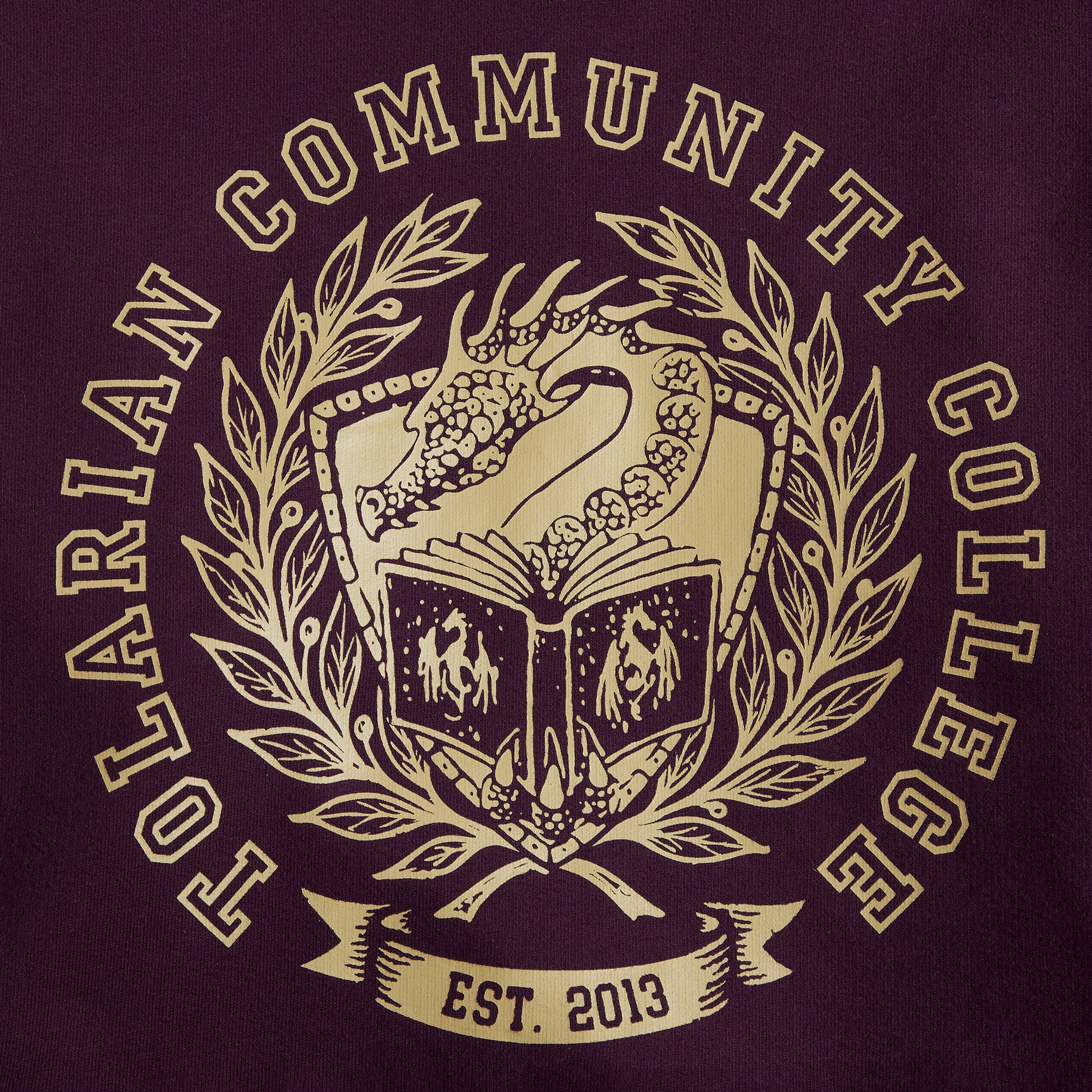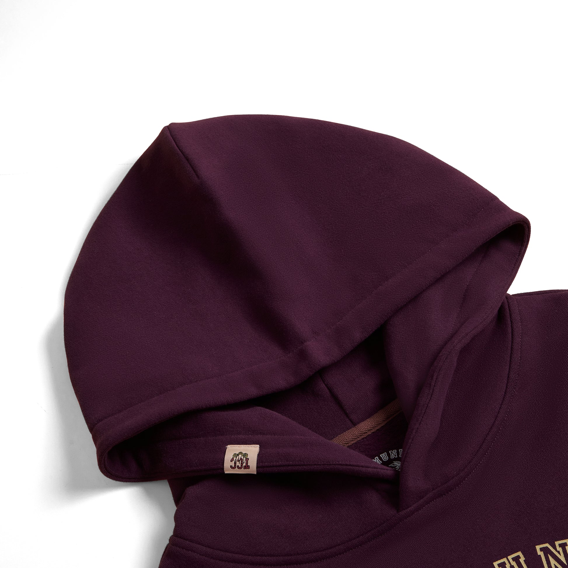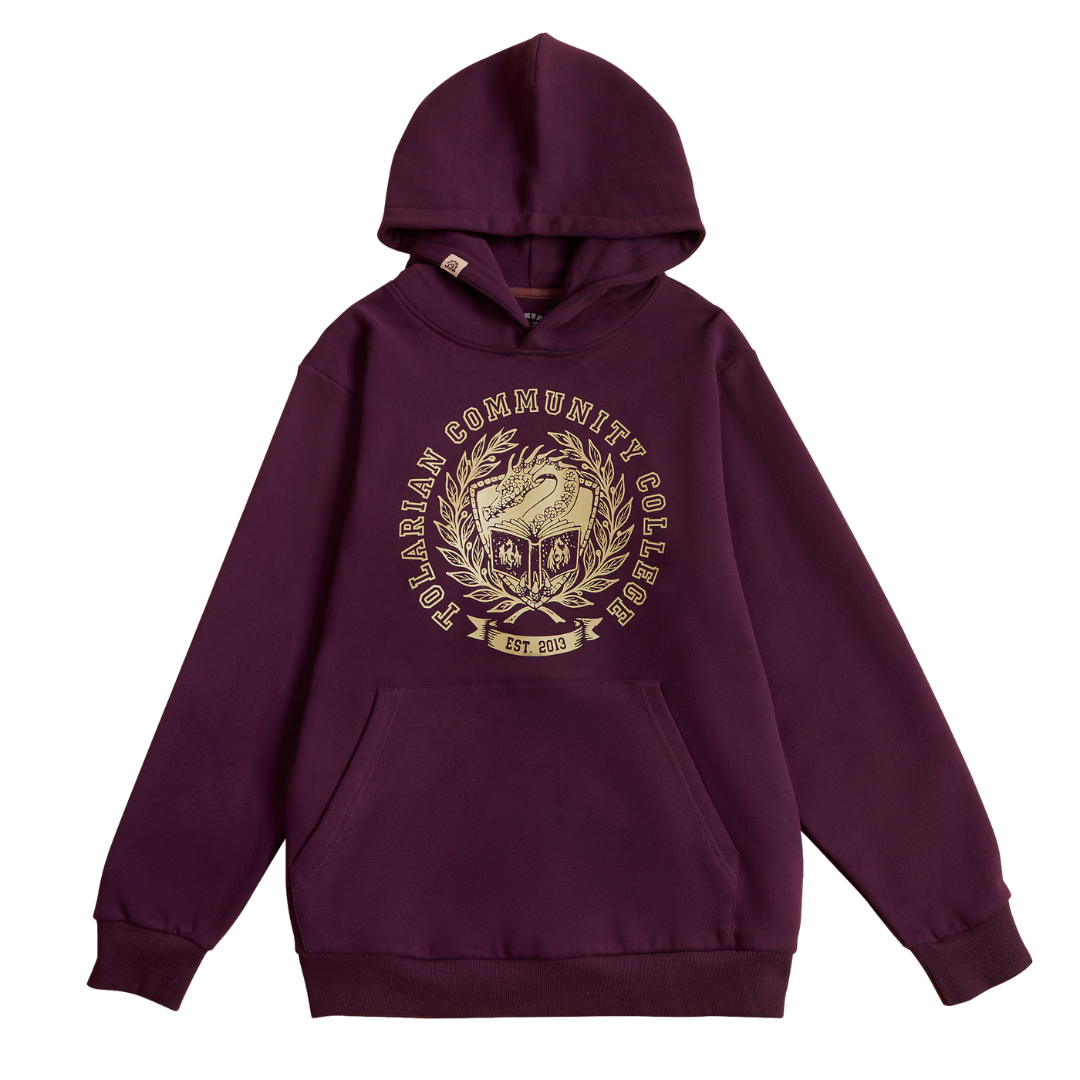Maroon hoodie with gold TCC crest. Collegiate style, alumni spirit.